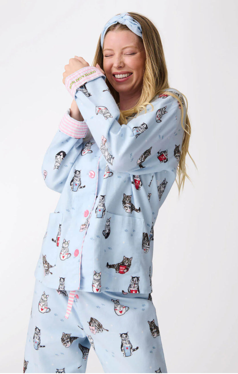 PJ SALVAGE-COFFEE AND CAT NAPS FLANNEL PJ SET-BLUE TINT