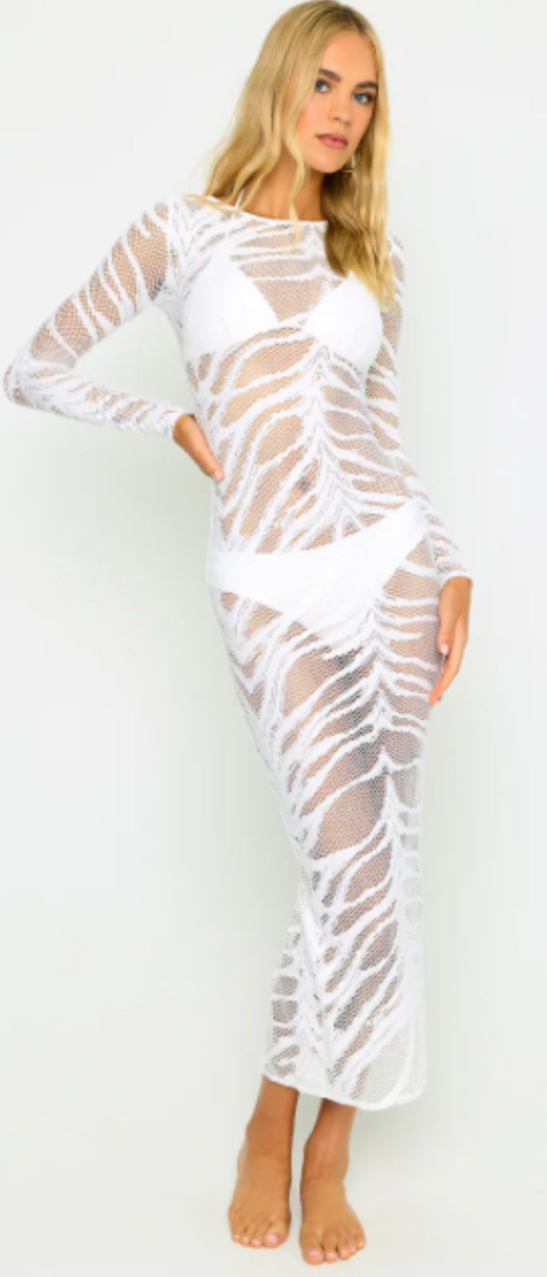 The Lacey Nights Maxi Dress is sheer and features a leg slit. Pair it with your favorite bikini!