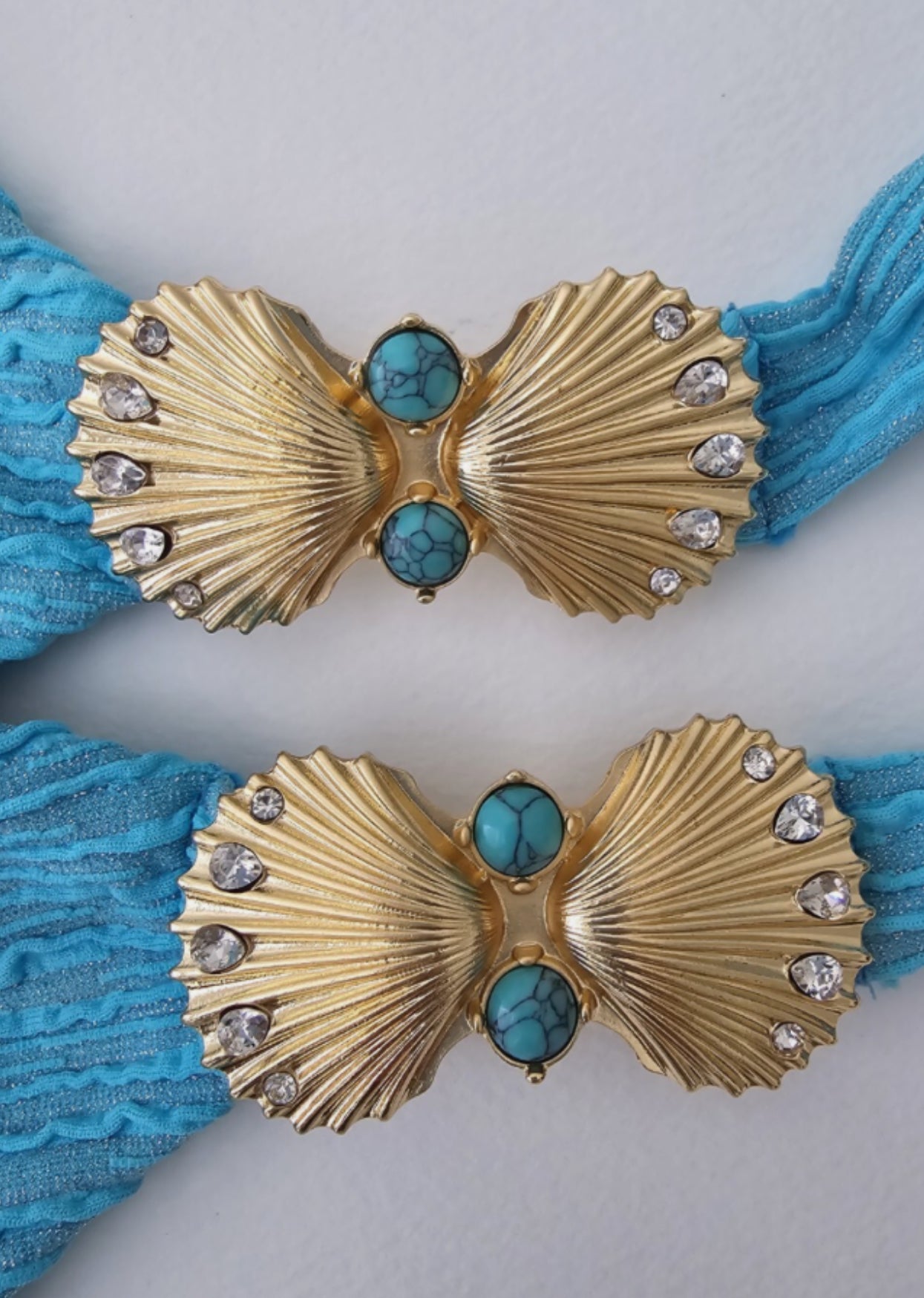 Lara Tri top, where luxurious style meets effortless sophistication. Crafted from shimmy fabric, this top offers a subtle, radiant sheen that catches the light with every move. The delicate shell hardware adds a touch of coastal charm, accented by a beautiful turquoise stone.